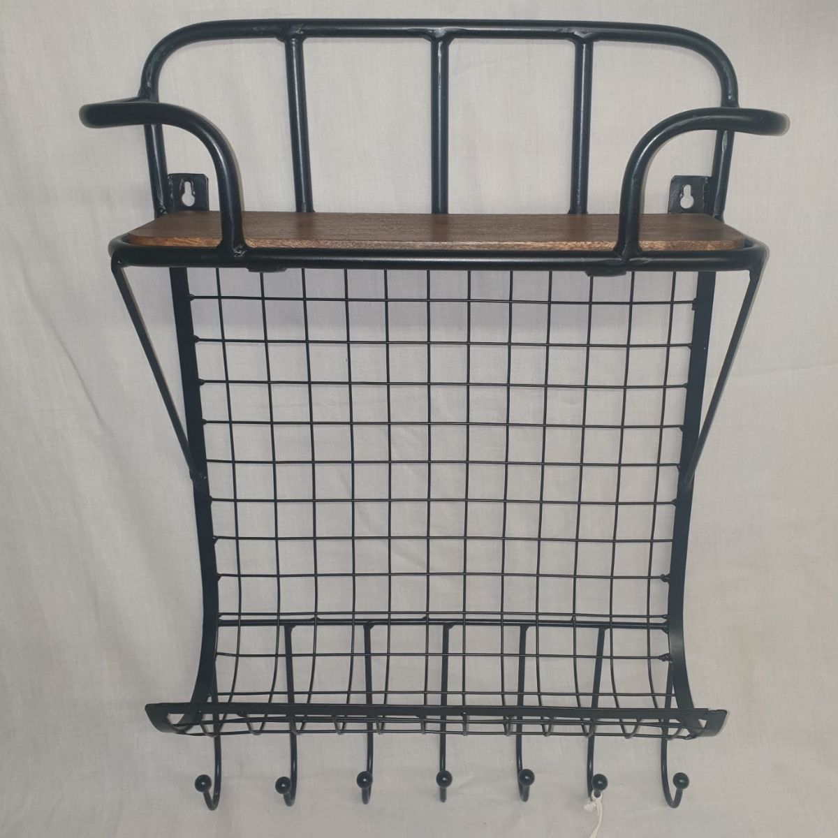Crafted with wooden shelves and steel frames, it's durable and functional with convenient hooks for added storage.